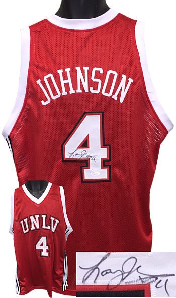 Larry Johnson played at the University of Nevada, Las Vegas to play under head coach Jerry Tarkanian. Alongside future NBA players Stacey Augmon and Greg Anthony, Johnson faced Duke Blue Devils in the title game of the 1990 NCAA Men's Division I Basketball Tournament. UNLV went on to win the contest by a score of 103–73, with Johnson contributing 22 points and 11 rebounds. The Runnin' Rebels set simultaneous NCAA records for the largest margin of victory and highest score in an NCAA Tournament championship game. Larry Johnson UNLV Runnin' Rebels has hand signed this Throwback Red unlicensed custom-prostyle jersey with twill stitched nameplate and numbers. JSA Hologram and Certificate of Authenticity. Size XL