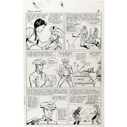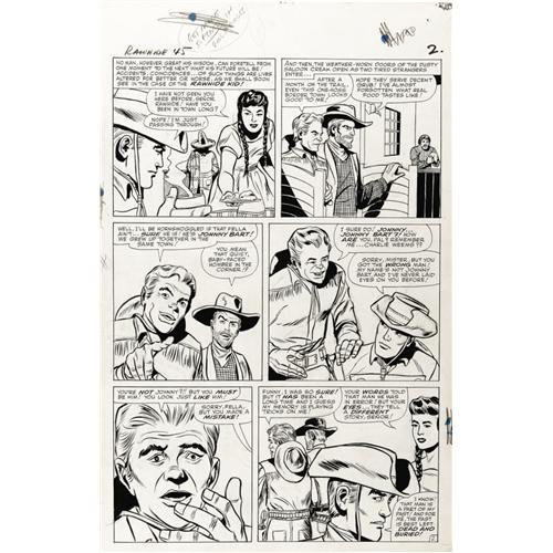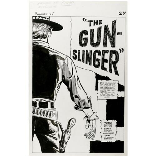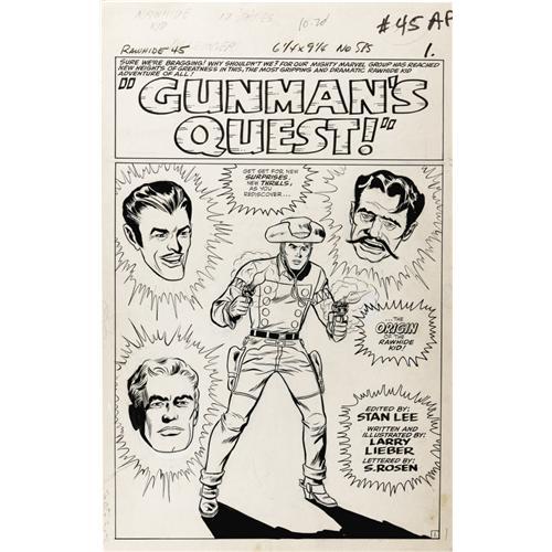 In the legends of the Old West, a man's worth was often measured by the strength of his convictions and the speed of his draw and no gunslinger was more feared or respected than Johnny Bart -- the Rawhide Kid. In this 17-page epic, the Kid's origin is recounted in stirring detail in "Gunmen's Quest." Also included in this landmark lot is the 5-page back-up thriller, "The Gun-Slinger", with a real Marvel-style "twist ending." Each page of terrific Larry Lieber Silver Age Western action has an image area that measures approximately 12" x 18", and the pages average Excellent condition.<BR><BR><b>Shipping:</b> Large Flat (<a target="_blank" href="http://www.heritageauctions.com/common/shipping.php">view shipping information</a>)