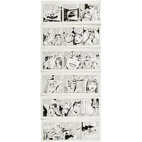 <B>Larry Lieber - The Amazing Spider-Man Daily Comic Strip Original Art, Group of 6 (King Features Syndicate, 2000).</B></I> Spider-Man and his wife, Mary Jane, star in these six consecutive dailies, dated 8-14, 8-15, 8-16, 8-17, 8-18, and 8-19-2000. The image area of each strip measures 13" x 4", and the art averages Excellent condition.<BR><BR><b>Shipping:</b> Flat Material, Small (<a target="_blank" href="http://www.heritageauctions.com/common/shipping.php">view shipping information</a>)