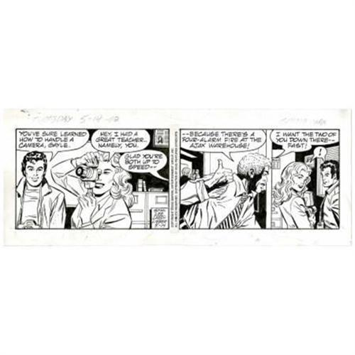 <B>Larry Lieber - The Amazing Spider-Man Daily Comic Strip Original Art, dated 5-14-02 (King Features Syndicate, 2002).</B></I> Shutterbugs Gayle and Peter Parker all called into action by Robbie Robinson in this episode. This daily has an image area of 13" x 4", and the art is in Excellent condition.<BR><BR><b>Shipping:</b> Flat Material, Small (<a target="_blank" href="http://www.heritageauctions.com/common/shipping.php">view shipping information</a>)