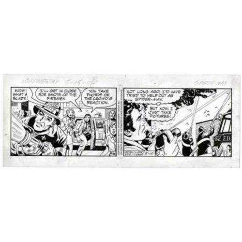 <B>Larry Lieber - The Amazing Spider-Man Daily Comic Strip Original Art, dated 5-15-02 (King Features Syndicate, 2002).</B></I> Peter Parker focuses on his role as a news photographer rather than as his other guise as your friendly neighborhood Spider-Man. This episode has an image area of 13" x 4", and the art is in Excellent condition.<BR><BR><b>Shipping:</b> Flat Material, Small (<a target="_blank" href="http://www.heritageauctions.com/common/shipping.php">view shipping information</a>)