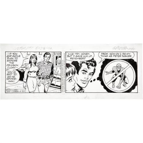 <B>Larry Lieber - The Amazing Spider-Man Daily Comic Strip Original Art, dated 6-22-02 (King Features Syndicate, 2002).</B></I> What? "Spider-Man no more?" Say it isn't so. This daily has an image area of 13" x 4", and it's in Excellent condition. <BR><BR><b>Shipping:</b> Flat Material, Small (<a target="_blank" href="http://www.heritageauctions.com/common/shipping.php">view shipping information</a>)