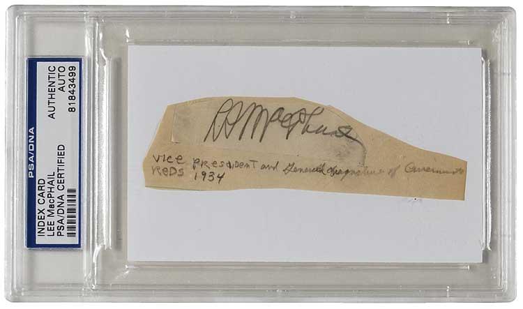 Vintage pencil signature, “L. S. MacPhail,” on an irregularly trimmed off-white slip, affixed to a slightly larger off-white slip. Encapsulated in a plastic PSA/DNA authentication holder. In very good condition, with closely trimmed edges and scattered light soiling. RRAuction COA.