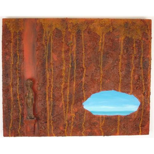 23 x 17 inches (58.5 x 43) oil, acrylic and mixed media on wood. Larry Mark Goldblatt is an artist who has been working in New York City for the past 30 years. He graduated from NYU and attended the Art Students' League. His work is in numerous private collections and has been shown in several galleries. His recent paintings in oil and wax on wood panels are evocative landscapes. The paint is built up layer upon layer, creating a rich patina. Some works incorporate rusted metal, carved or tribal figures, and ethnographic objects. The marriage of object and flat scenic surface create a tension - the works become a crossover between painting and sculpture. The Museum of Fine Arts in St. Petersburg, Florida has just recently acquired a Goldblatt painting for their permanent collection.