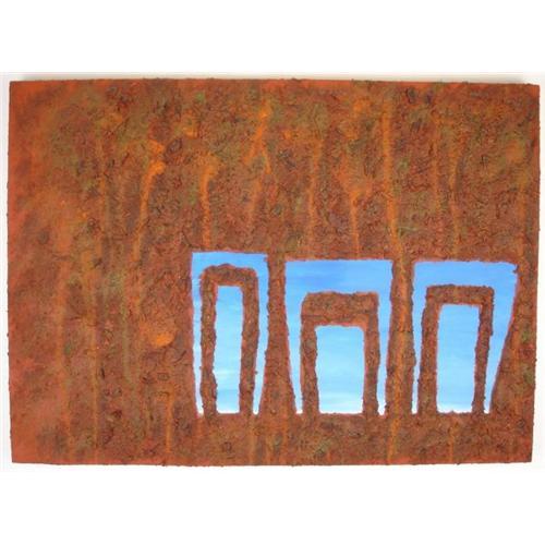 30 x 22.5 inches (38 x 28 cm) oil, acrylic, and mixed media on wood. Larry Mark Goldblatt is an artist who has been working in New York City for the past 30 years. He graduated from NYU and attended the Art Students' League. His work is in numerous private collections and has been shown in several galleries. His recent paintings in oil and wax on wood panels are evocative landscapes. The paint is built up layer upon layer, creating a rich patina. Some works incorporate rusted metal, carved or tribal figures, and ethnographic objects. The marriage of object and flat scenic surface create a tension - the works become a crossover between painting and sculpture. The Museum of Fine Arts in St. Petersburg, Florida has just recently acquired a Goldblatt painting for their permanent collection.