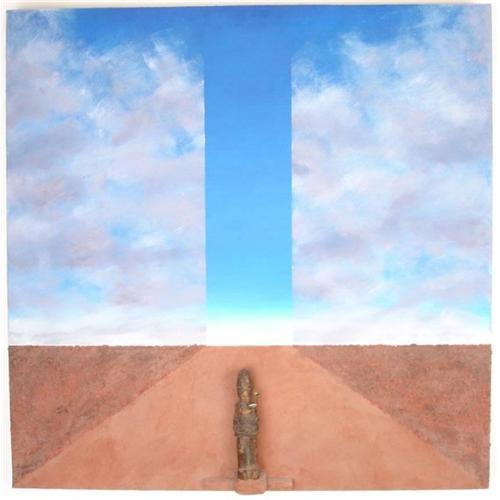 23 x 23 inches (23 x 23 cm) oil, acrylic, wax, and mixed media on wood. Larry Mark Goldblatt is an artist who has been working in New York City for the past 30 years. He graduated from NYU and attended the Art Students' League. His work is in numerous private collections and has been shown in several galleries. His recent paintings in oil and wax on wood panels are evocative landscapes. The paint is built up layer upon layer, creating a rich patina. Some works incorporate rusted metal, carved or tribal figures, and ethnographic objects. The marriage of object and flat scenic surface create a tension - the works become a crossover between painting and sculpture. The Museum of Fine Arts in St. Petersburg, Florida has just recently acquired a Goldblatt painting for their permanent collection.