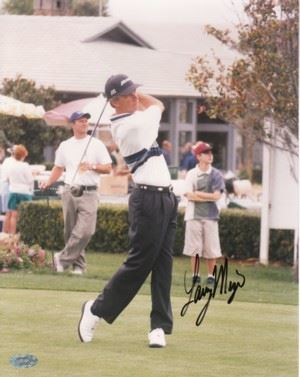 Larry Mize played on the PGA Tour and currently plays on the Champions Tour. He is well-known for one career-defining shot — a chip from off the green at the 11th hole at Augusta to win the playoff for the 1987 Masters Tournament, which was his only major title. Larry Mize has hand autographed this 8x10 Color Photo. Mounted Memories Hologram and Certificate of Authenticity.