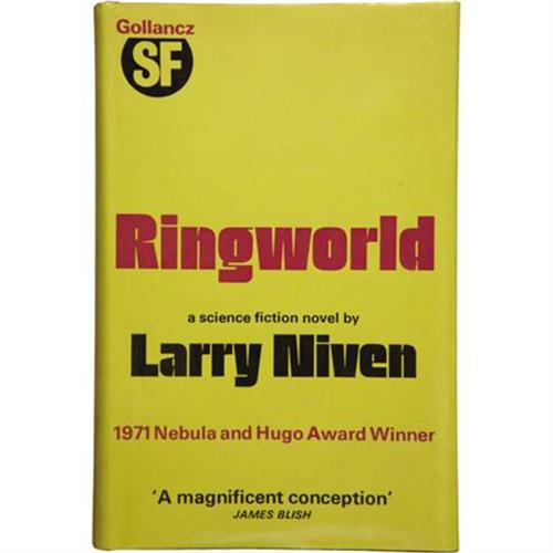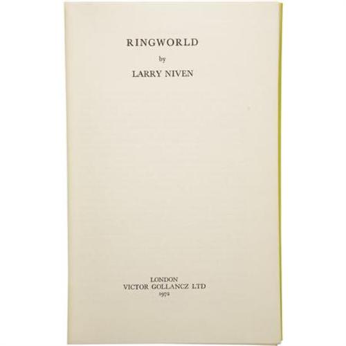 <B>Larry Niven. </B></I><B><I>Ringworld</B></I></B></I><B>.</B></I> London: Victor Gollancz, 1972.<BR><BR>First hardcover edition. Octavo. 288 pages. <BR><BR>Publisher's original maroon cloth with gilt titles on the spine. A tight copy in a slightly soiled dust jacket. Fine condition.<BR><BR>A particularly nice copy of this 1970 Nebula and 1971 Hugo award winner for best novel. Originally published in 1970 by Ballantine in a paperback edition. <I>From the Robert and Diane Yaspan Collection.</B></I><BR><BR><b>Shipping:</b> Books & Catalogs (<a target="_blank" href="http://www.heritageauctions.com/common/shipping.php">view shipping information</a>)