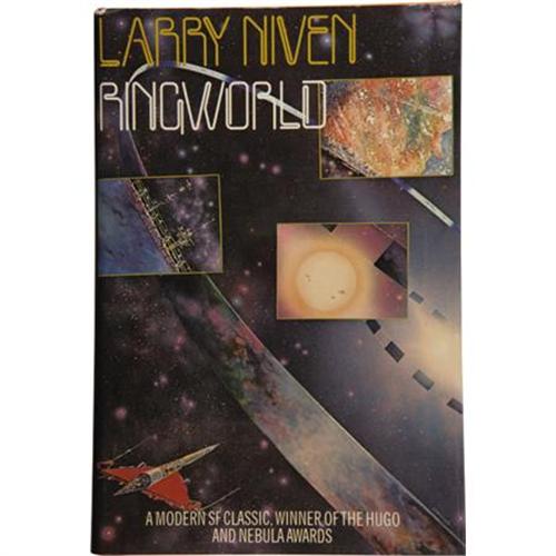 <B>Larry Niven. </B></I><B><I>Ringworld</B></I></B></I><B>.</B></I> New York: Holt, Rinehart and Winston, 1977.<BR><BR>First hardcover edition. Inscribed by the author on the title page. Octavo. 342 pages.<BR><BR>Original orange boards and orange cloth backstrip with silver titles on the spine. Very light shelf wear. Internal contents clean and tight. Dust jacket with illustration by Rick Sternbach in beautiful condition. A fine copy. <I>From the Robert and Diane Yaspan Collection.</B></I><BR><BR><b>Shipping:</b> Books & Catalogs (<a target="_blank" href="http://www.heritageauctions.com/common/shipping.php">view shipping information</a>)