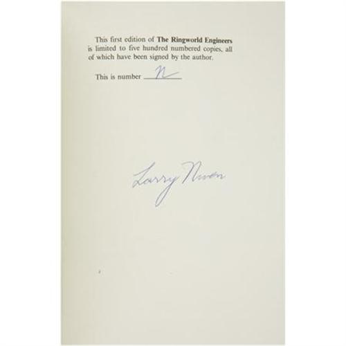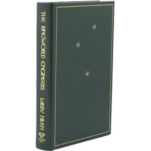 <B>Larry Niven. </B></I><B><I>The Ringworld Engineers</B></I></B></I><B>.</B></I> Huntington Woods: Phantasia Press, 1979.<BR><BR> First edition, one of twenty-six lettered presentation copies specially bound in goat-skin and signed by the authored. Octavo. 355 pages. Frontispiece by Paul Lehr. Map laid-in back.<BR><BR>Full green goat-skin with gilt titles on the spine and gilt rules and stars on the front board. Beautiful with virtually no blemishes. Internal contents bright and tight. A fine copy with publisher's limitation letter laid-in. <I>From the Robert and Diane Yaspan Collection.</B></I><BR><BR><b>Shipping:</b> Books & Catalogs (<a target="_blank" href="http://www.heritageauctions.com/common/shipping.php">view shipping information</a>)