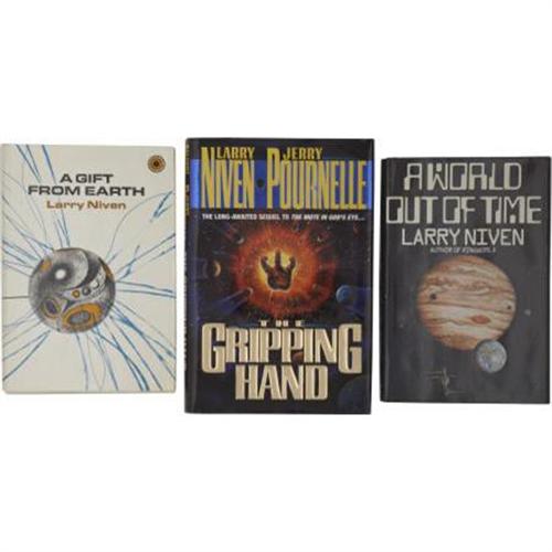 <B>Larry Niven. Three First Editions, Two Inscribed,</B></I> including: <B><I>A World Out of Time</B></I></B></I>. New York: Holt, Rinehart and Winston, [1976]. First edition. Inscribed by the author on the title page. Octavo. 243 pages. Publisher's blue cloth over blue paper boards with silver spine titles. In original pictorial dust jacket. Textblock toned around the edges, and minimal wear to the dust jacket edges, else fine. [and:] <B><I>A Gift from Earth</B></I></B></I>. New York: Walker and Company, [1970]. First American hardcover edition. Inscribed by the author on the title page. Octavo. 254 pages. Publisher's white cloth with black spine titles. In original pictorial dust jacket. Light rubbing to the boards at the spine folds, and the bottom edge, with light brown staining along the bottom edge of the boards. Dust jacket has minor wear at the spine ends, else a fine copy. [and:] [with Jerry Pournelle] <B><I>The Gripping Hand</B></I></B></I>. New York: Pocket Books, [1993]. First edition. Octavo. 401 pages. Publisher's dark blue cloth over blue paper boards with gilt spine titles. In original pictorial dust jacket. Minimal shelf wear to the book and dust jacket, else fine. <I>From the Robert and Diane Yaspan Collection.</B></I><BR><BR><b>Shipping:</b> Books & Catalogs (<a target="_blank" href="http://www.heritageauctions.com/common/shipping.php">view shipping information</a>)