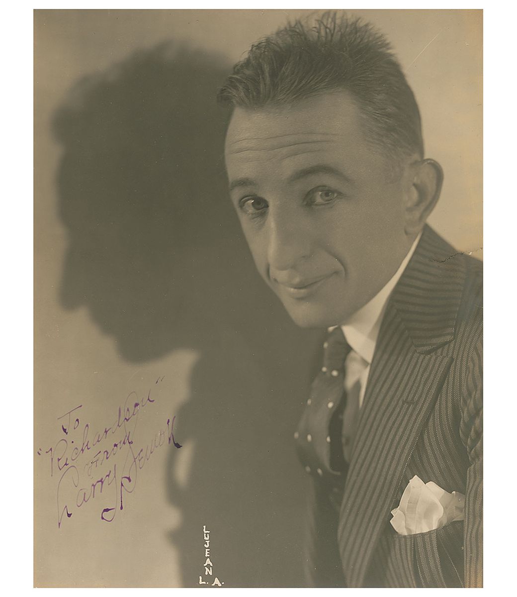 Film comedian (1889–1928) during the silent era, once considered a ‘Comedy King,’ but now mainly remembered for working with both Stan Laurel and Oliver Hardy. Semon is also known for directing, as well as appearing, in the 1925 silent film the Wizard of Oz. Vintage matte-finish 7 x 9 portrait by Lujean of Los Angeles, signed and inscribed in purple ink, “To ‘Richardson,’ from Larry Semon.” In very good to fine condition, with a few creases to the upper left, a small tear to the right border repaired with tape on the reverse, and trivial silvering to dark areas of the image.