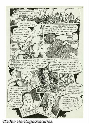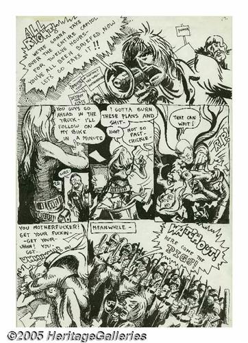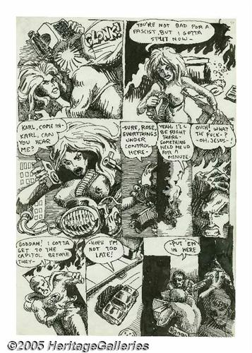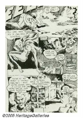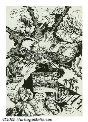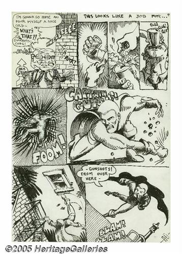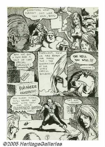 <B>Larry Welz - Captain Guts #1, Complete 23-page Story Original Art (Print Mint, 1973).</B></I> Hang onto your beer can, bud -- 'cause offered here is the art for a yarn from Larry Welz' groundbreaking <B>Captain Guts</B></I> #1! After contributing to the <B>Yellow Dog</B></I> for about three years, Larry got an itch to branch out and create his own title, instead of the few bi-monthly pages he had been doing. The result was <B>Captain Guts</B></I>, defender of the vast silent majority. Of course, Welz would go on to create <B>Cherry</B></I>, one of the sexiest adult comics ever published. There are twenty-three pages in this lot, one piece makes up pages 12 and 13 in the twenty-four page story. Each page measures 12" x 18" with no white-out or tape, some glue may be present due to panels being redone; otherwise the art is in Very Good condition.