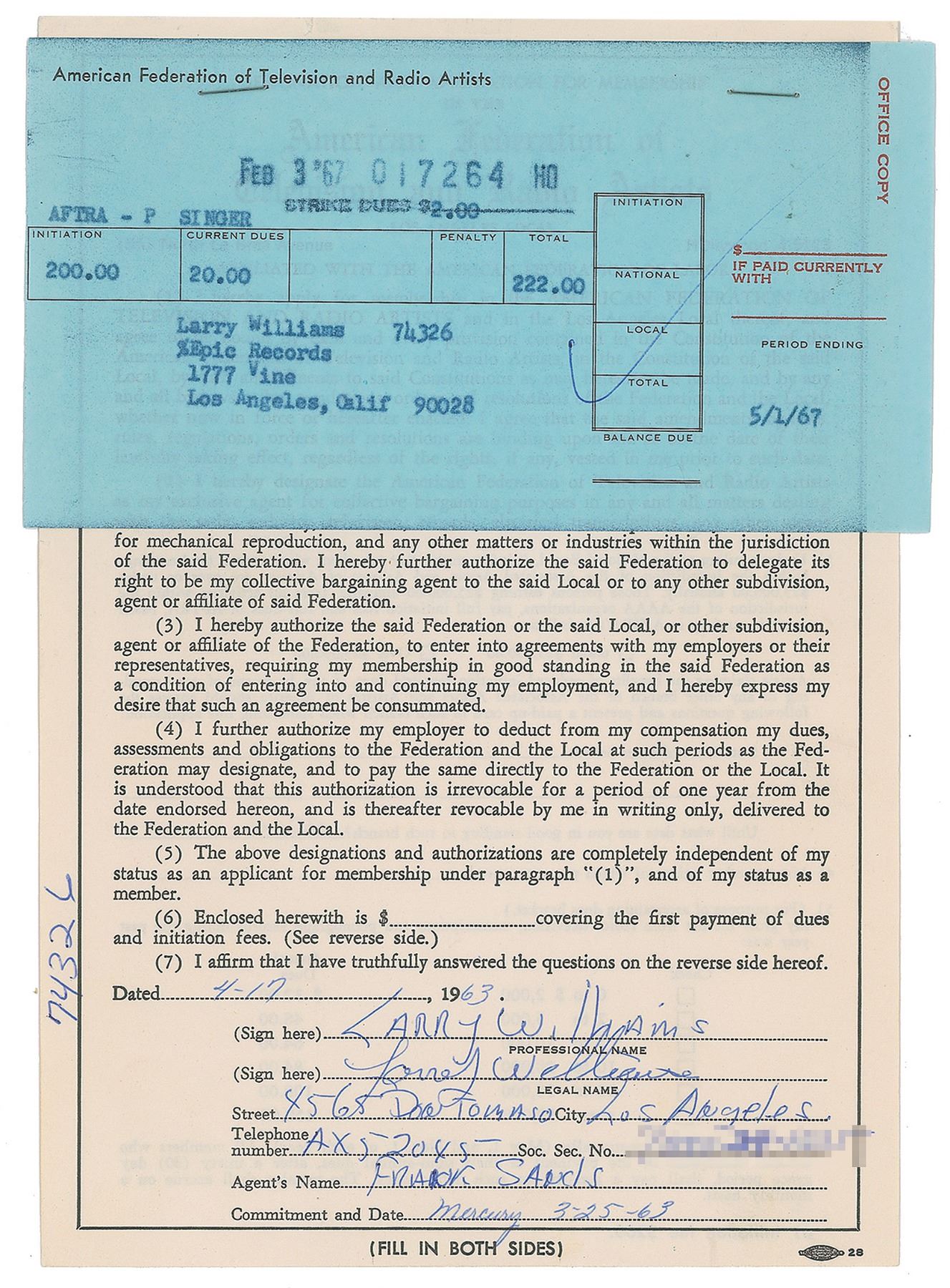 Rhythm and blues and rock and roll singer-songwriter, producer, and pianist (1935–1980) known for his classic hits 'Bony Moronie,' 'Short Fat Fannie,' 'Slow Down,' 'Dizzy Miss Lizzy,' 'Bad Boy,' and 'She Said Yeah.' Partly-printed DS, one page, 6 x 8.75, April 17, 1963. Application for membership in the American Federation of Television and Radio Artists (AFTRA), signed twice at the conclusion by Williams, and filled out with his personal information. A blue carbon copy receipt is stapled at the top. In fine condition. Accompanied by a picture sleeve for the 45 RPM record 'Slow Down / Dizzy, Miss Lizzy.'