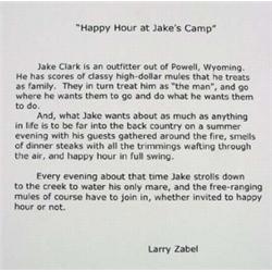 Larry Zabel (b.1930) (Montana) Oil on Canvas. "Happy Hour. At Jake's Camp." 18" x 24". signed lower right. Est $5,000 - $7,000.