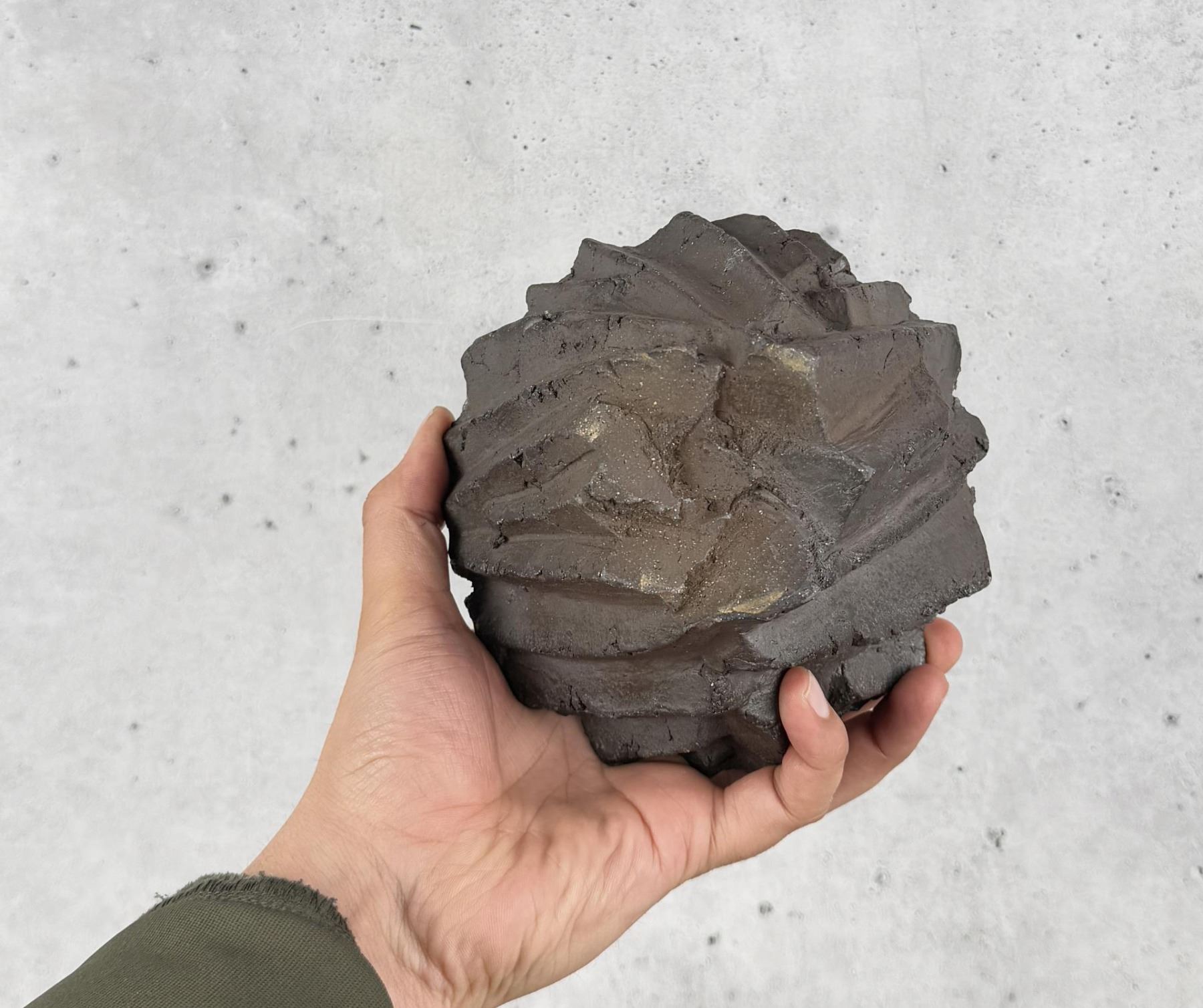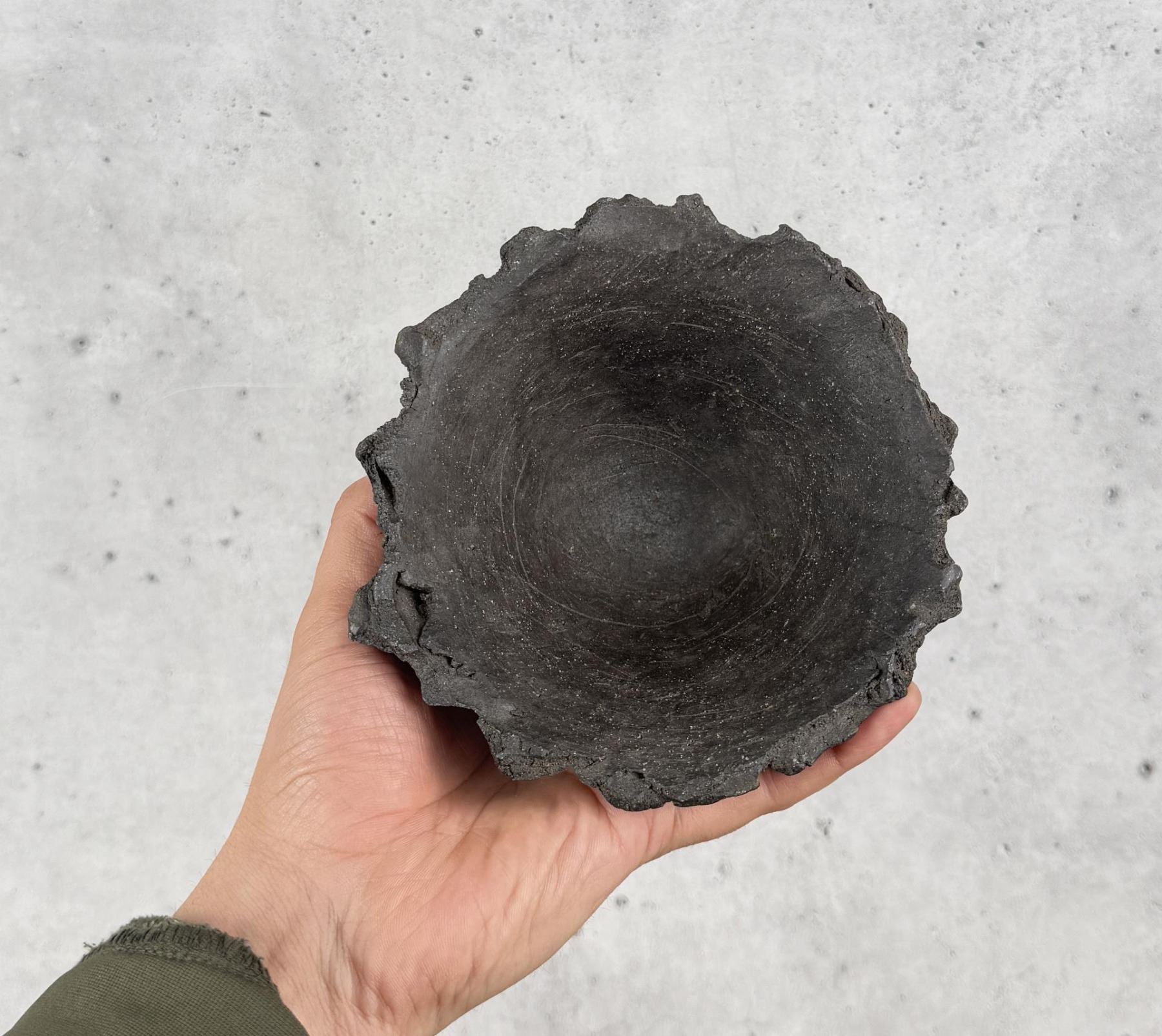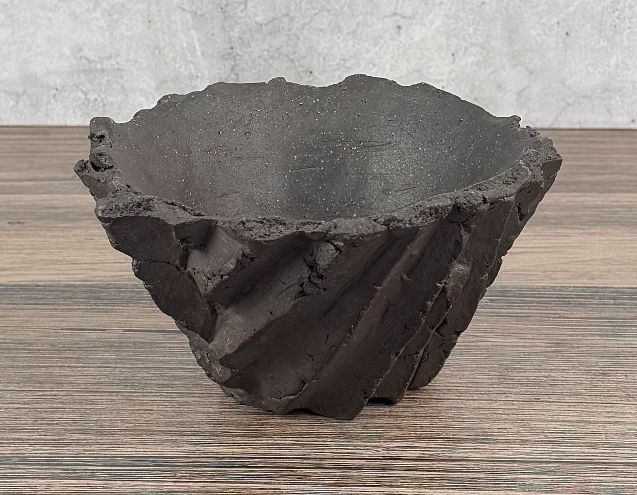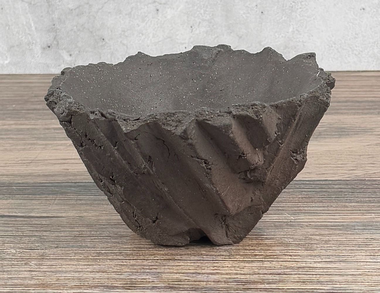 6" diameter, 3 3/8" tall. Artist Statement My explorations within geologic phenomenon, language, mass, volume and diversity of form develop awareness to connections with base materials and environments. My work encompassing vessels built upon dynamic forms, diversely bodied clay and turbulent, colorful wood fired surfaces assert a continued geologic impact on our understanding of the conditions of contemporary life. Viewing the ceramic vessel as a crucial synergy between the material world and our cultural existence drives my investigations. Smooth volumes, stressed surfaces, thick slashes, jagged edges, ripped and torn segments of a vessel act as abstracted conduits to potent Earth features and physicality while not obliterating inherent containment and presentation properties. Compressing rugged forms with obvious volumes in this way evoke reactive spatial relationships. Ranges of dark color built in the volatile atmosphere of a wood kiln extend connections to material diversity reflected in the world. Dynamic additive and subtractive layering of information through forming and firing, akin to deposition and erosion, point toward constantly shifting our immediate relationship to massive geologic systems. Ceramic vessels act as agents of metaphor, exploring relationships to severe aspects of geology. Drawing connections between domestic contexts and dramatic geologic forces, I set out to evoke a sense that what shapes our understanding of our surroundings is inherently tumultuous and continually shifting in intimate ways within and beyond our control.