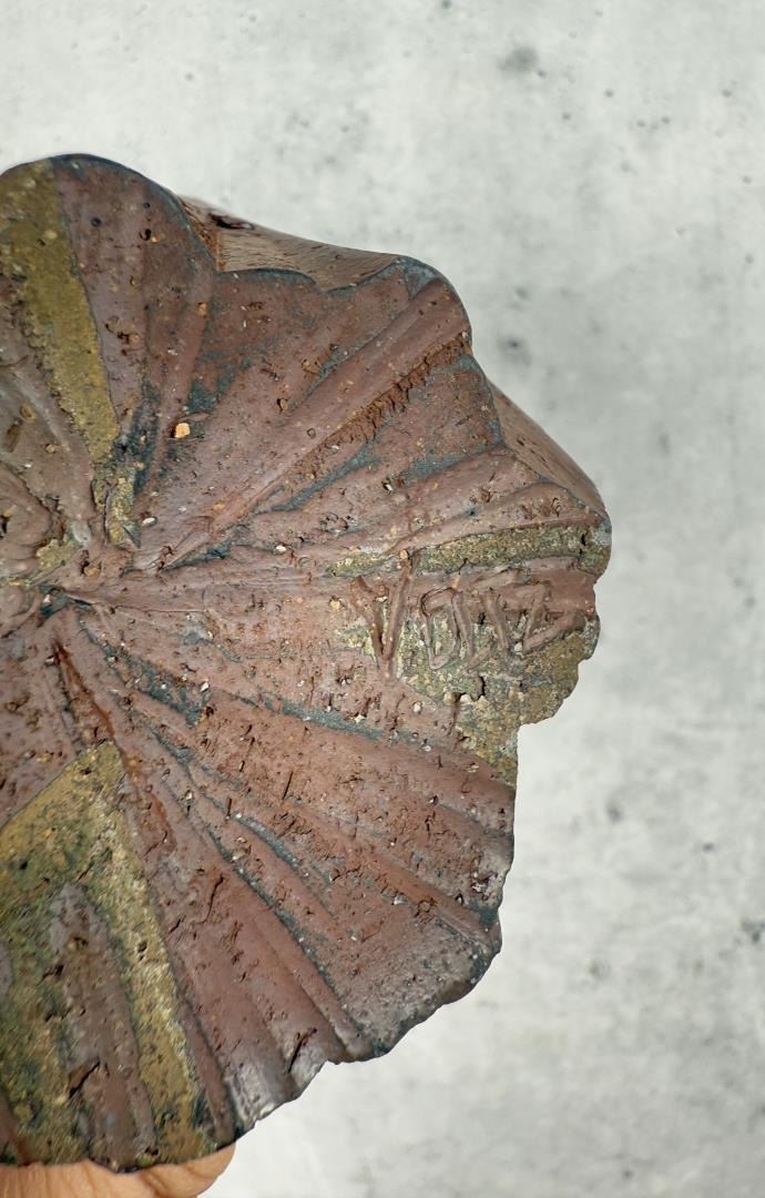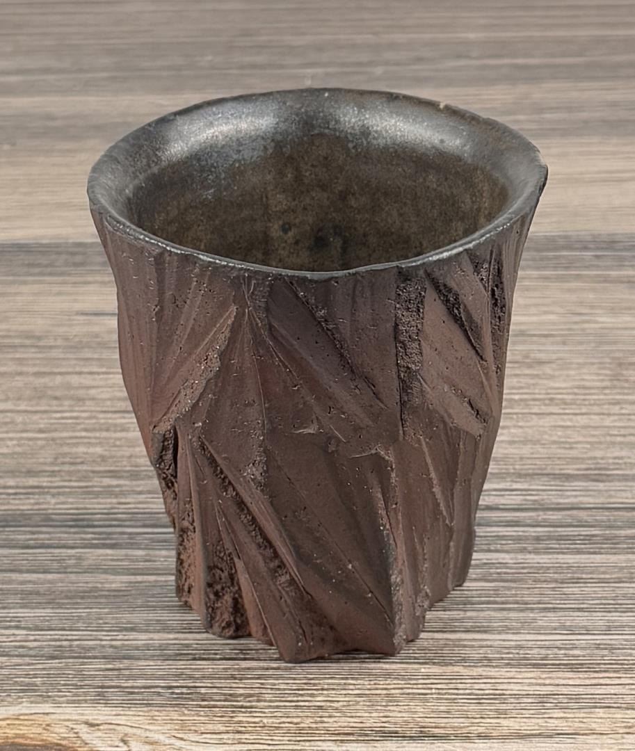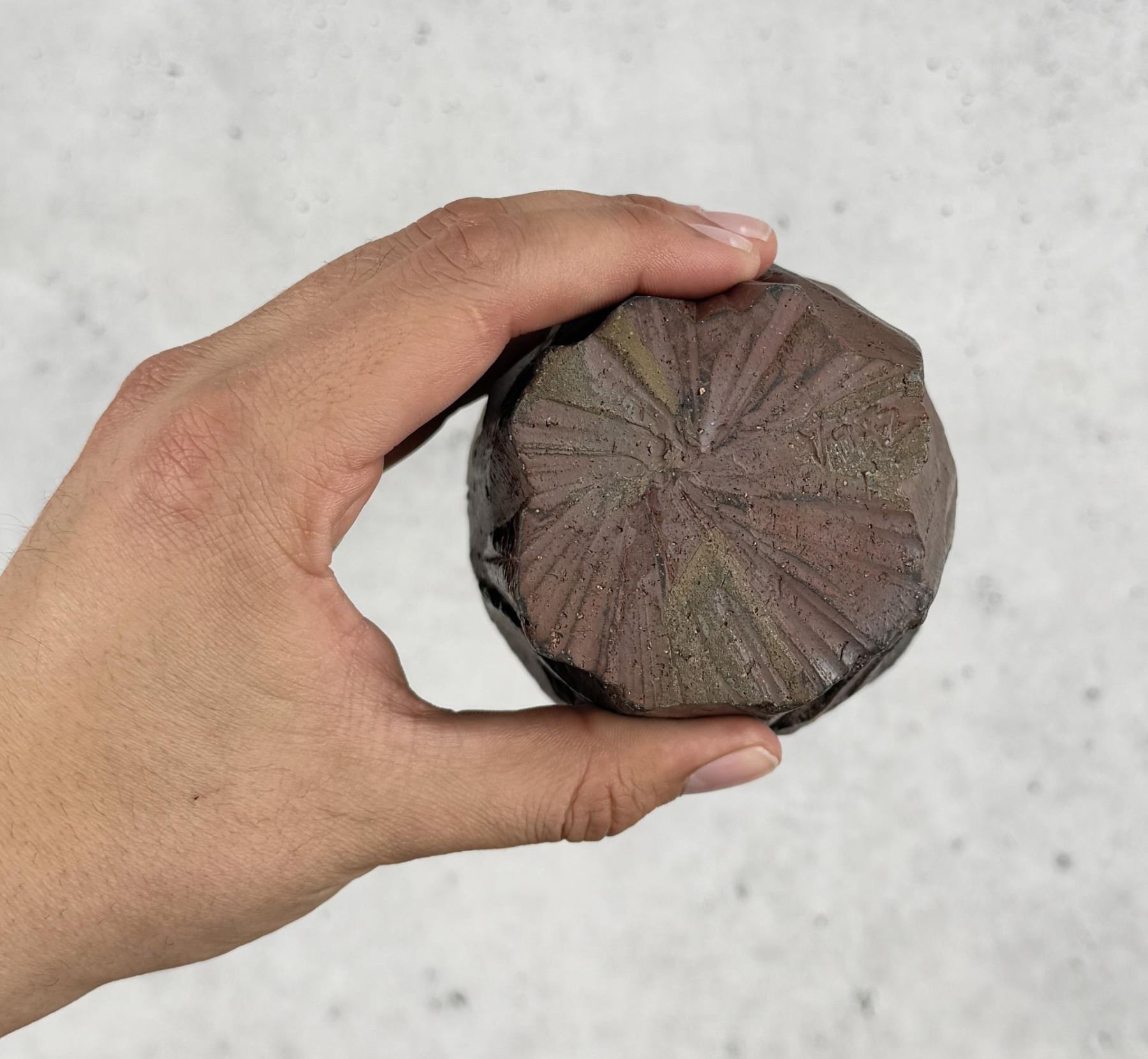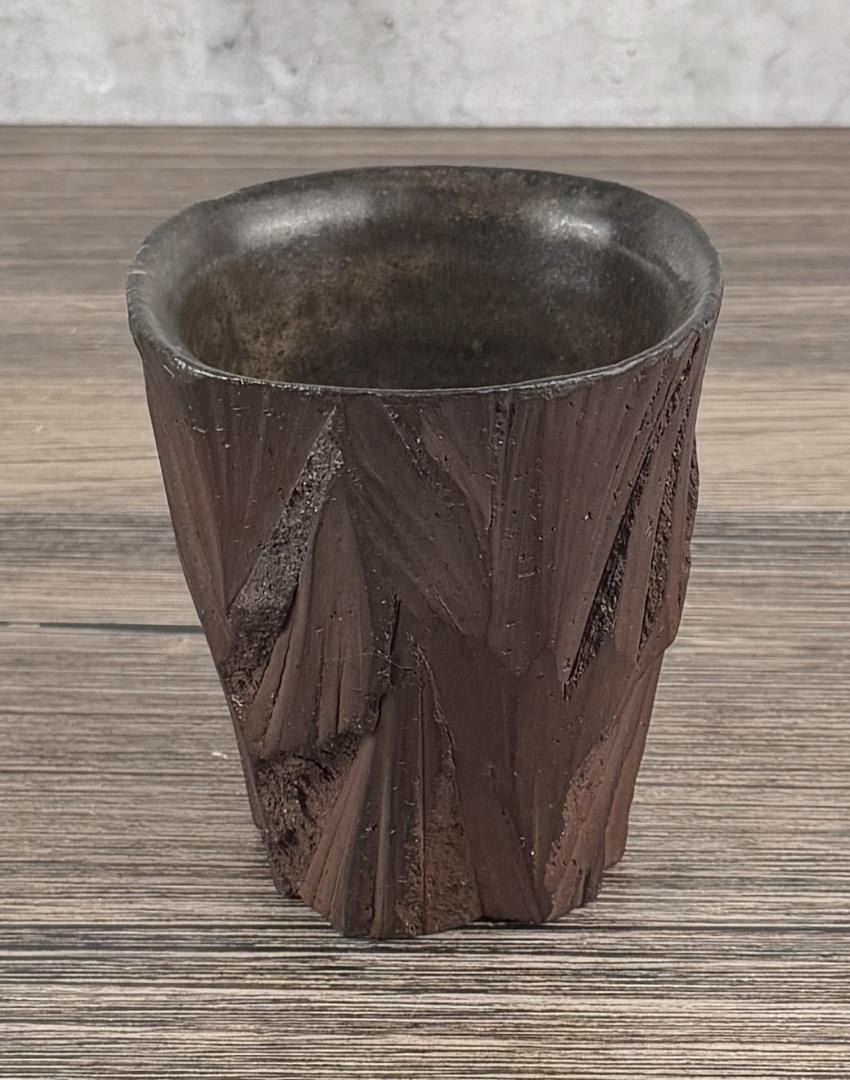 4 1/8" tall, 3 3/4" diameter. Artist Statement My explorations within geologic phenomenon, language, mass, volume and diversity of form develop awareness to connections with base materials and environments. My work encompassing vessels built upon dynamic forms, diversely bodied clay and turbulent, colorful wood fired surfaces assert a continued geologic impact on our understanding of the conditions of contemporary life. Viewing the ceramic vessel as a crucial synergy between the material world and our cultural existence drives my investigations. Smooth volumes, stressed surfaces, thick slashes, jagged edges, ripped and torn segments of a vessel act as abstracted conduits to potent Earth features and physicality while not obliterating inherent containment and presentation properties. Compressing rugged forms with obvious volumes in this way evoke reactive spatial relationships. Ranges of dark color built in the volatile atmosphere of a wood kiln extend connections to material diversity reflected in the world. Dynamic additive and subtractive layering of information through forming and firing, akin to deposition and erosion, point toward constantly shifting our immediate relationship to massive geologic systems. Ceramic vessels act as agents of metaphor, exploring relationships to severe aspects of geology. Drawing connections between domestic contexts and dramatic geologic forces, I set out to evoke a sense that what shapes our understanding of our surroundings is inherently tumultuous and continually shifting in intimate ways within and beyond our control.