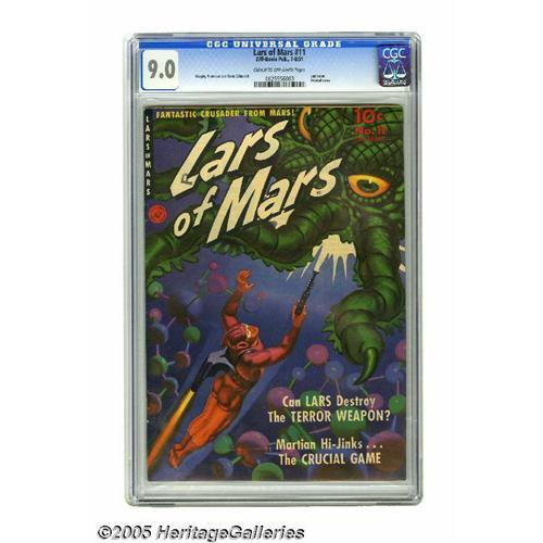 <B>Lars of Mars #11 (Ziff-Davis, 1951) CGC VF/NM 9.0 Cream to off-white pages.</B></I> Comics from publisher Ziff-Davis are noted for their beautiful painted covers, and this comic, developed by " "<B>Superman</B></I> co-creator Jerry Siegel, is certainly no exception. It's the last of only two issues featuring the outer space adventurer; both issues feature covers considered ""classic"" by Overstreet. This one's a real doozy, featuring a hideous (for comic books, that's a good thing) green tentacled monster. The fun continues inside, with art by Gene Colan and Murphy Anderson. Overstreet 2005 VF/NM 9.0 value = $623; NM- 9.2 value = $840. CGC census 8/05: 3 in 9.0, none higher. <BR><BR><B>Important notice:</B> Heritage usually auctions material at the rate of 200-250 lots per hour. On some occasions eBay Live bid software or the Internet may not be able to keep up with the pace of the auction. We recommend placing a realistic absentee bid now as insurance to avoid disappointment. Occasionally the auctioneer may eliminate or reject an eBay Live bid, and the auctioneer may also reopen a lot after the close of the eBay live bidding (usually because we missed an audience bid), and may reject your bid even if it shows you as the winning bidder. By bidding via eBay Live, you agree that Heritage may award the lot to another bidder at its sole discretion under the circumstances described above or any other reasonable circumstances. Since eBay bids are not shown to us until we open the lot on the floor, we treat those bids just like floor bids. In most cases the floor responds before the eBay bid is presented to us, due to Internet lag time, so for consistency we have made it a policy that floor bids are always considered first over tie eBay live bids. Also please note that all Heritage lots purchased through eBay Live carry a 20% Buyer's Premium. Please make sure you read the Terms and Conditions before you bid. This lot is being auctioned in conjunction with a live floor