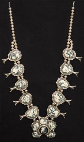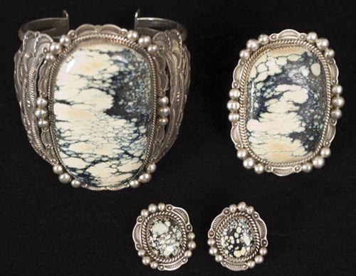 Larson Leopard Lee Navajo Turquoise Set. Includes Squash blossom necklace, bracelet, ring and earrings. Fabulous and rare white buffalo turquoise, large size and pristine condition. (est $2,000-3,000)