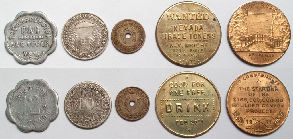 Lot of five. 1) Scalloped The Charleston Bar of Las Vegas. GF 12 1/2c IT. Has wear. 2) Boulder City Co of Boulder City. 10c Good only at Boulder City Co. Stores. 3) Las Vegas transit System. Good for one Fair. 4) W. V. Wright, 220 S. Bruce in Las Vegas. "Wanted Nevada Trade Tokens.' 1971. Reverse Good for one free drink on February 29th. 5) Hoover Dam Commutative. From the Maish Collection of Nevada Tokens!City: Las VegasCounty: ClarkState: NVDate: