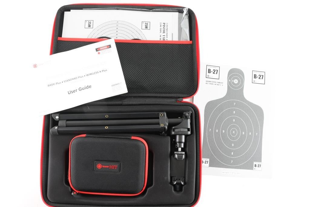 works with your smart phone and an installed application. Includes tripod, target, 45 ACP and 9mm laser insert cartridges, cables, case. Appears to be excellent condition, not tested.