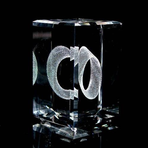 Laser Light crystal block paperweight with a laser sculpture of a Mobius strip; beveled edges. Height 3".