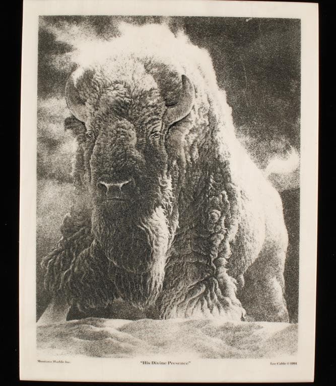 Laser etching of buffalo in winter on white corian board with stand, approx. 10-1/2” x 8-1/2” entitled “His Divine Presence”. Est.: $25-$50.