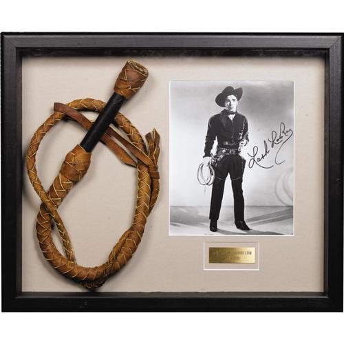 <B>Lash LaRue's Signature Bullwhip from TV's "Lash of the West," with Signed Picture.</B></I> Black-clad Lash LaRue and his bullwhip rose in fame together, from poverty row Westerns of the late 1940s to the 1953 TV series <I>Lash of the West.</B></I> The Saturday matinee idol had a colorful post-stardom life, including an alleged 10 to 12 marriages, an appearance in the X-rated <I>Hard on the Trail</B></I> (1971), and later penitent missionary work when he realized that the aforementioned film was actually a porn movie. (He hadn't been around when the sex scenes were shot.) At any rate, this display presents Lash (1917-1996) in his whip-cracking prime, complete with his coiled brown bullwhip and a dashing portrait of Lash with the whip, boldly signed in black, "Lash LaRue." The black frame measures 17" x 21" with a glass front, and a small plaque set inside the tan matte reads "Lash LaRue Production Used Whip." A wire attached to the back allows immediate display. This is a professionally mounted tribute to one of the most flamboyant of the low budget cowboy stars, whose gregarious nature delighted fans during his late-in-life western convention appearances. In Excellent condition. <I>From the Ann Sothern Estate. Accompanied by LOA from LA Prop & Wardrobe Company.</B></I><BR><BR><b>Shipping:</b> Miscellaneous Collectibles, Smal (<a target="_blank" href="http://www.heritageauctions.com/common/shipping.php">view shipping information</a>)