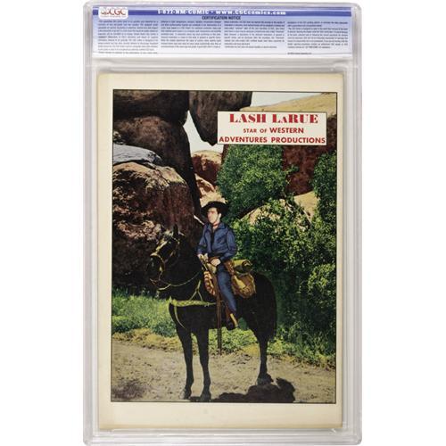 <B>Lash LaRue Western #1 (Fawcett, 1949) CGC NM 9.4 Off-white pages.</B></I> Fawcett scored a coup by gaining the rights to publish the comic book adaptation of this Western hero. Lash's popularity, garnered via a spate of Saturday matinee thrillers that would run and be re-run for many years, translated into an impressive comic book run of 84 issues over twelve years. Overstreet 2006 NM- 9.2 value = $1,500. CGC census 11/06: 3 in 9.4, none higher.<BR><BR><b>Shipping:</b> Slabbed Comic (<a target="_blank" href="http://www.heritageauctions.com/common/shipping.php">view shipping information</a>)