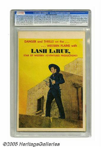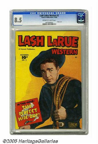 <B>Lash LaRue Western #2 (Fawcett, 1949) CGC VF+ 8.5 Off-white to white pages.</B></I> Something about a man in black who cracks a whip - but a woman in black with a whip would've been a bigger hit! The simple yet striking photo cover is emphasized on this copy, exceeded in grade by only one other in CGC's census. Overstreet 2005 VF 8.0 value = $281; VF/NM 9.0 value = $428. CGC census 5/05: 1 in 8.5, 1 higher.