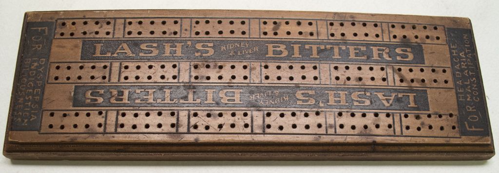 Unusual cribbage board with Lash's Bitters ad. The word "for" replaced "cures" in 1906