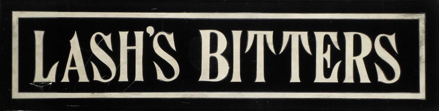 Lash's Bitters Reverse Glass Sign. Attributed to Western Sandblasting, Chicago. Excellent condition. 22 X 5 3/4 inches. Start Price $50