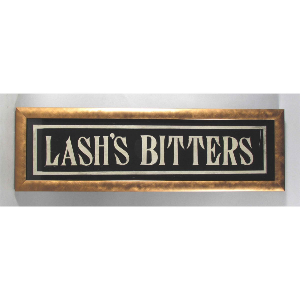 Lash's Bitters Reverse Glass Sign. Attributed to Western Sandblasting Co. Chicago. Excellent condition. 23 1/2 X 7 1/2 inches in metal frame. Start Price $50