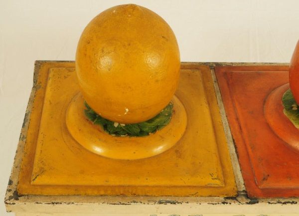 Rare double soda fountain syrup dispenser. Painted Tin Body With Applied water labels. Has Dual Interior Stoneware Crocks With a figural lid depicting an orange & a lemon. Measures 27" x 13.75" x 23'Tall Overall.