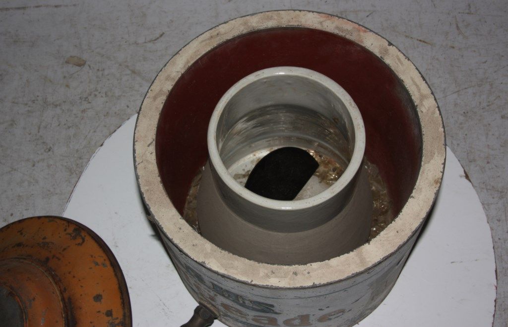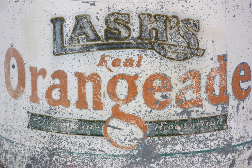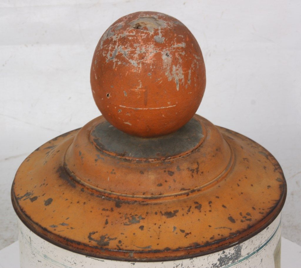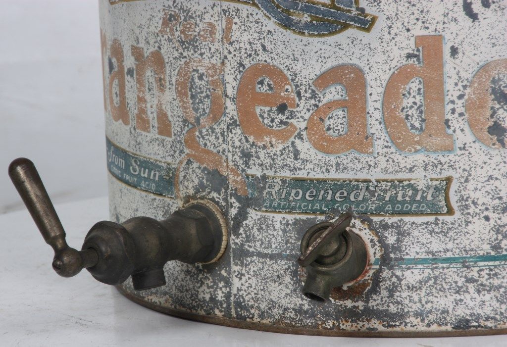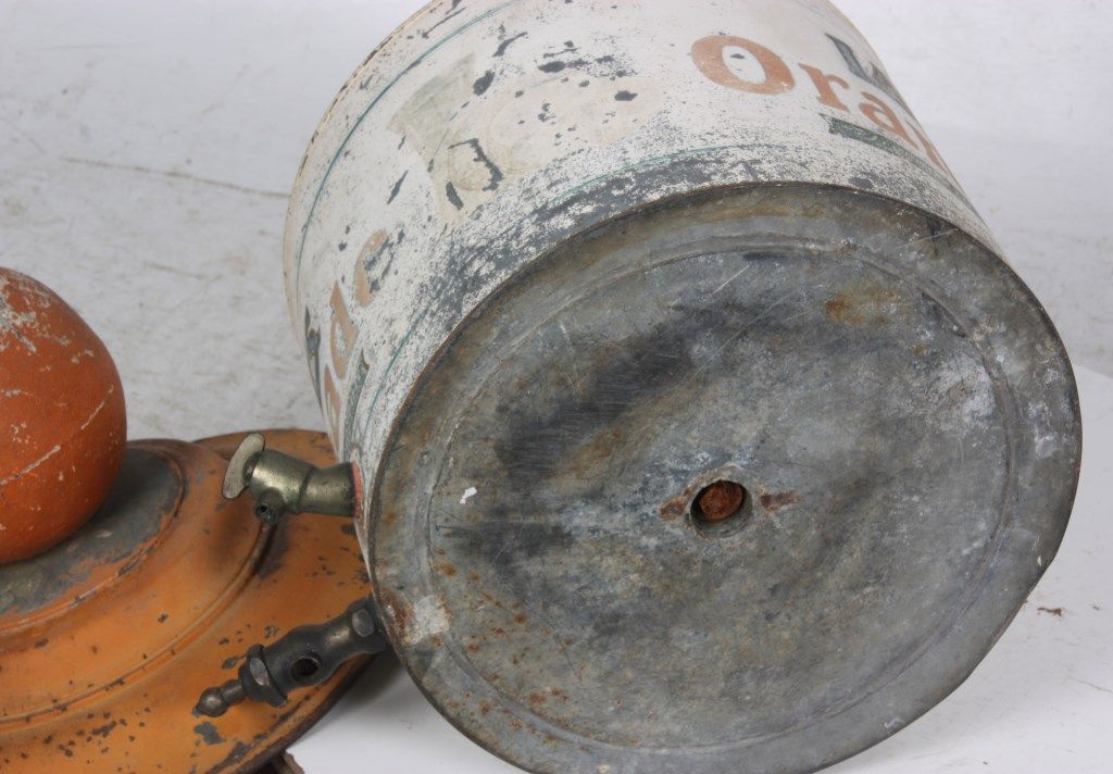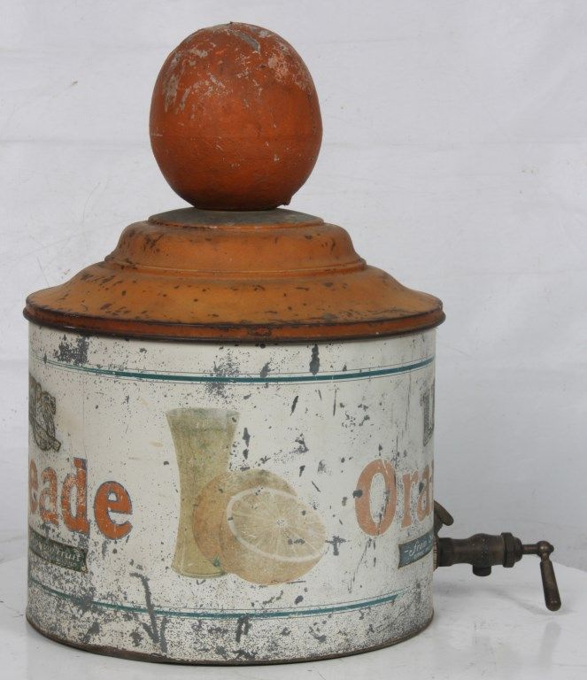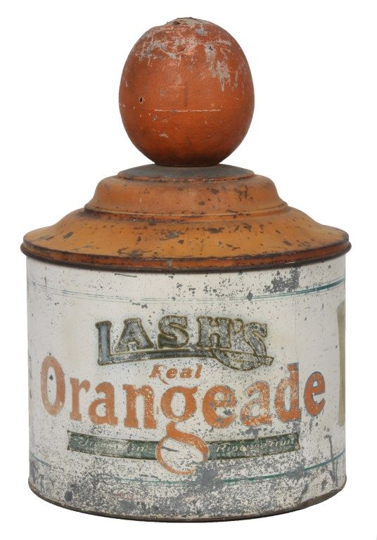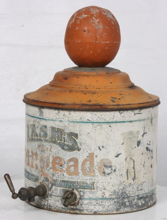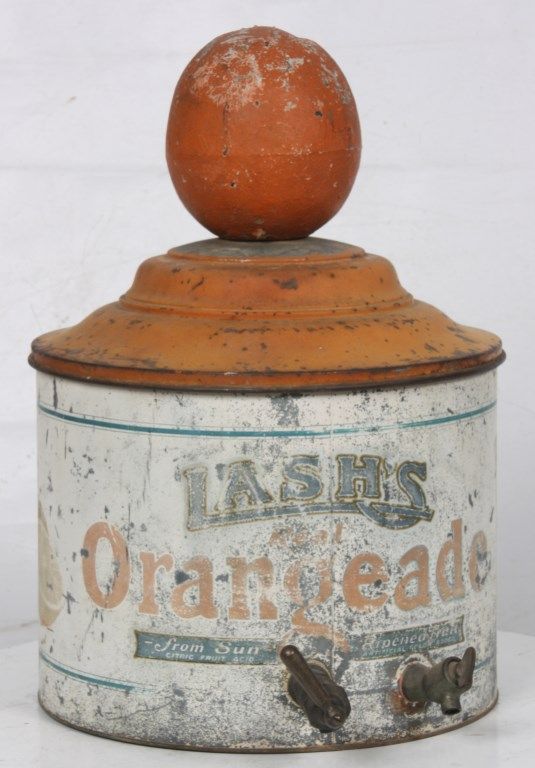 Lash's Orangeade Cooler & Dispenser. Drum shaped tin body has original paint with white background, orange and blue lettweing and borders reads - Lash's Real Orangeade, From Sun Ripened Fruit, Citric Fruit Acid, Artificial Color Added. with taps in the front for dispensing the beverage and draining water from the cooler. Tin lid is painted orange and has a large paper mache orange shaped finial on the top; beverage is contained in a large earthenware crock inside of the cooler. In good overall condition showing some age and paint loss and some damage to the top fruit finial. 20 in. high x 14 in. dia.