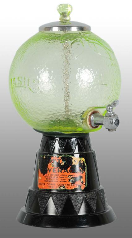 1940s. Includes black milk glass base with green embossed depression glass top and original syrup spigot. Lash label is peeling. Condition (8.5+, Excellent). Size 13" T.