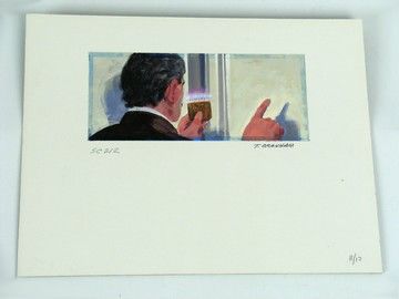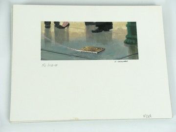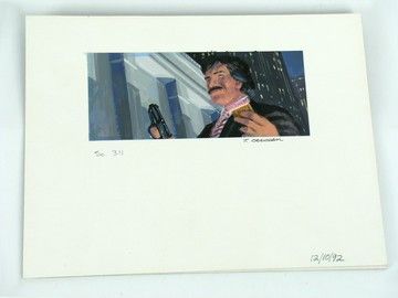 Benedict (Charles Dance) is a fictional movie-within-a-movie villain in the Arnold Schwarzenegger fantasy-action thriller "Last Action Hero" (1993). Finding the magic ticket that got a young boy Danny (Austin O'Brien) into the movie, Benedict uses the same ticket to transport into the real world and cause come major havoc. These are extremely rare, and beautiful original acrylic color storyboards, each drawn, then individual matted and mounted by celebrated storyboard artist T. Cranham. In six exquisitely realized paintings, they show Benedict using his magic ticket to get into the real world. Each is signed by the artist, with the date and scene number. They are ready to be framed and displayed. (Each original painting is 7"x3" on thick matte card (11"x8.5"). Comes with a COA.