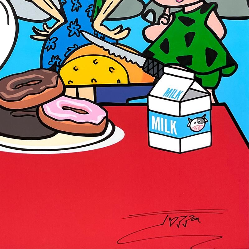 "Last Breakfast I" is a unique mixed media acrylic on gallery wrapped canvas by Jozza. Hand Signed by the artist and titled in verso, the piece comes with a letter of authenticity. Measures approximately 48" x 60" (image).