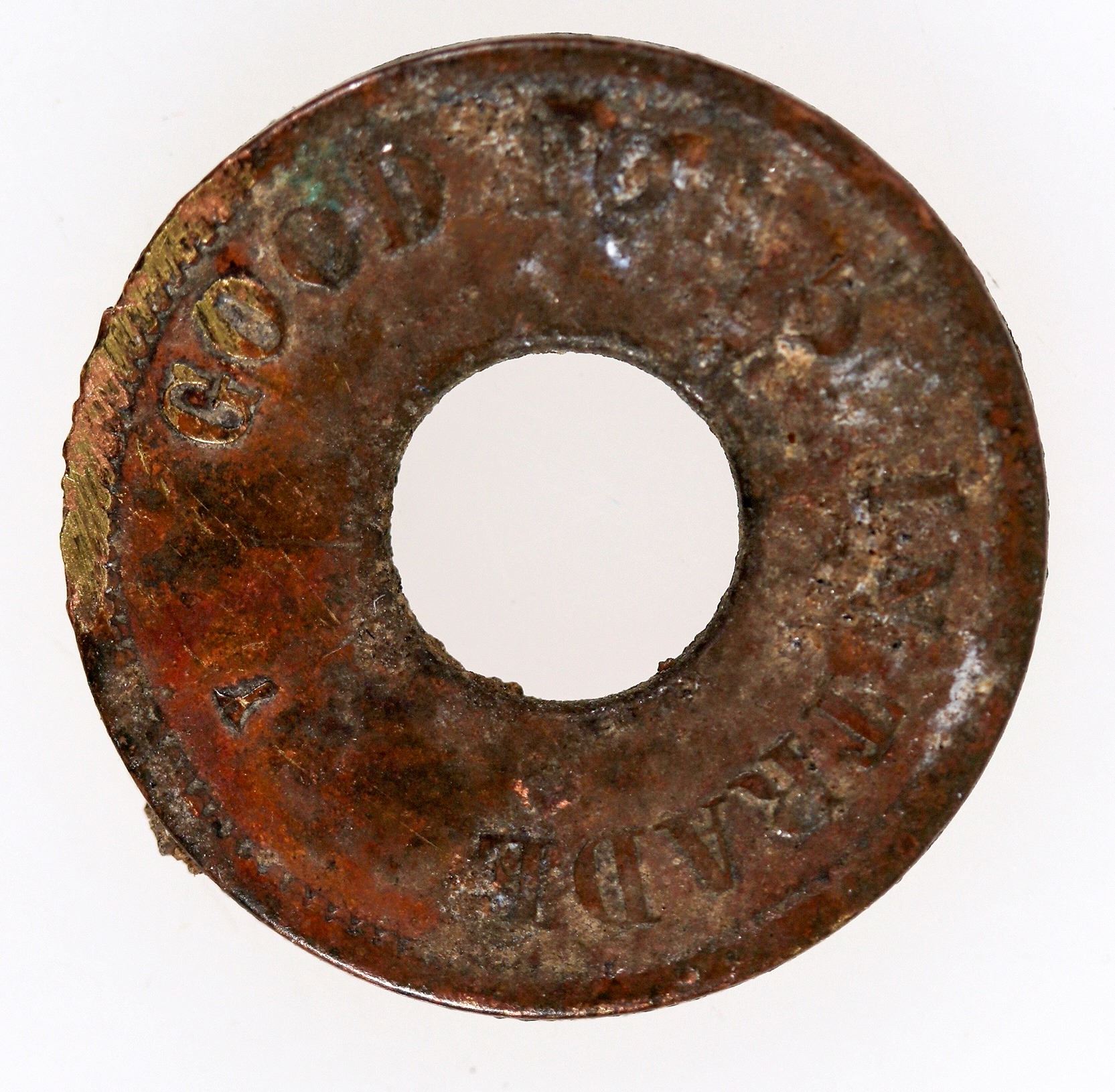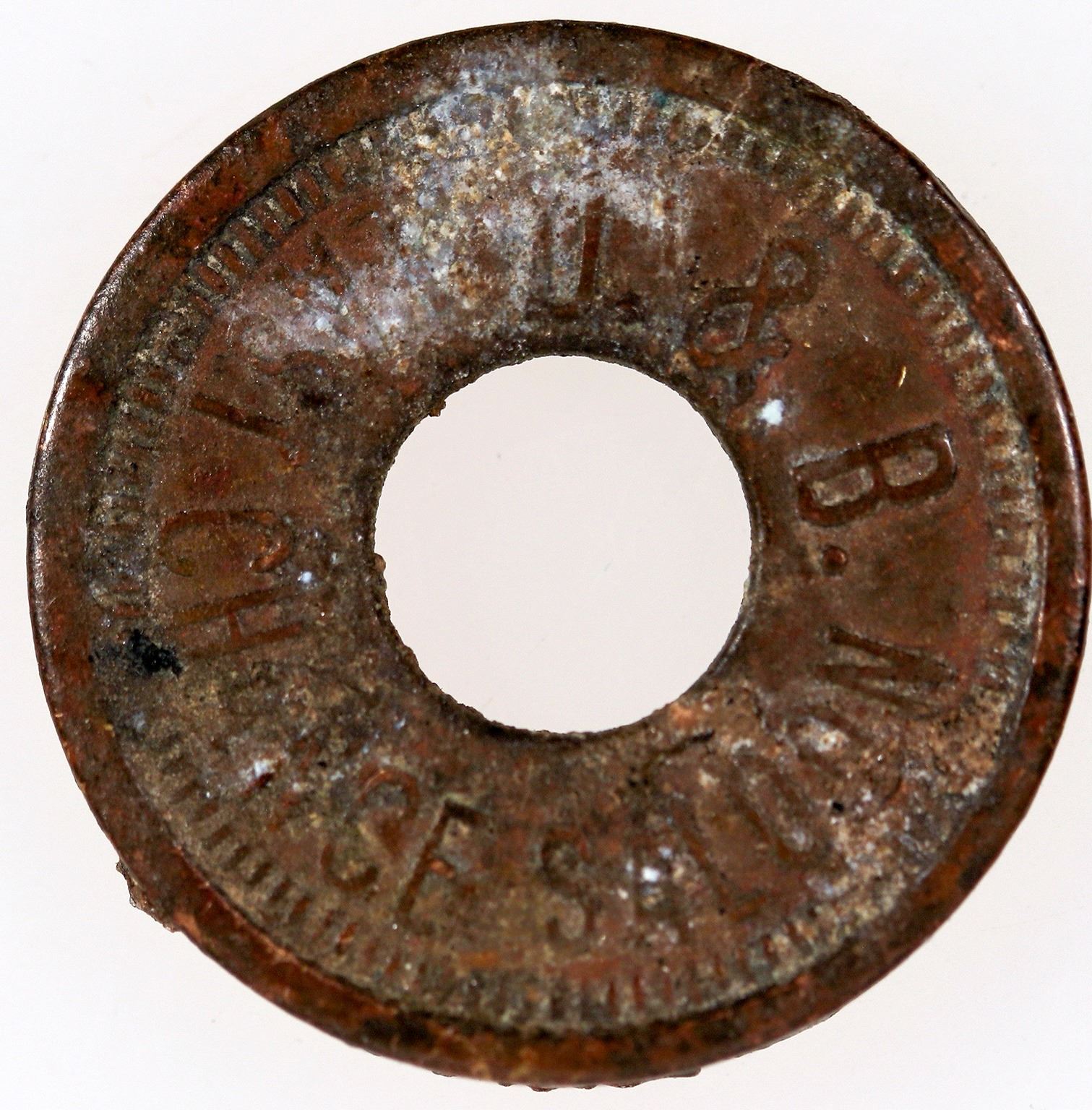 Spooner says R 10; 1902-1911. D. & B. / LAST CHANCE SALOON // GOOD FOR 5c IN TRADE (round-center cutout); Br.; rd., 21 mm.