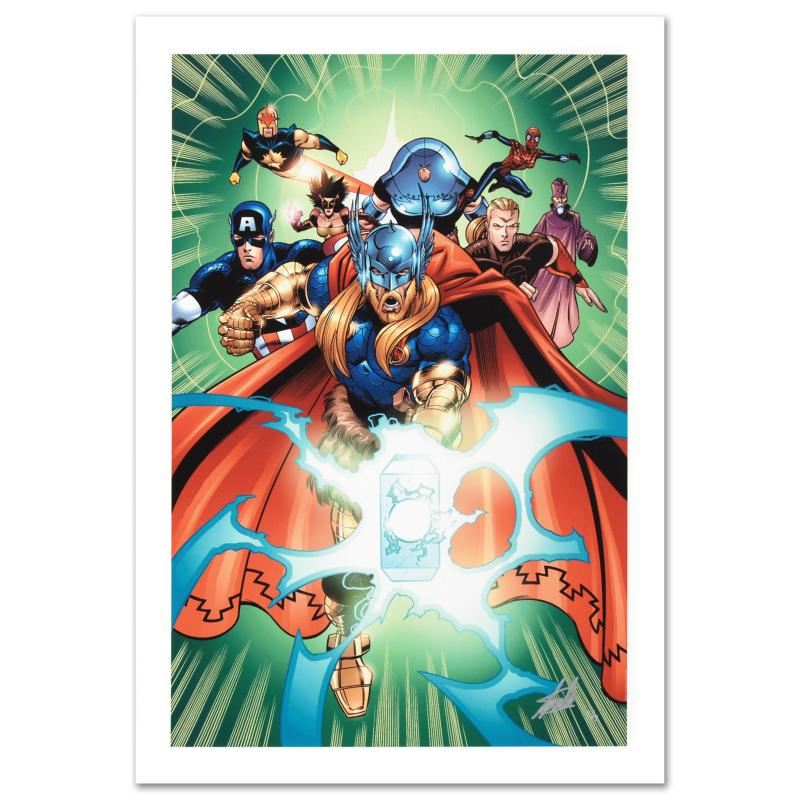 A piece of comic book history, this limited edition, from original art by Patrick Olliffe, depicts the classic characters Thor, Captain America and Spider woman among many others. Best known for his work on the Spider-Man and Spider-Girl franchises, Patrick Olliffe is also a published author and illustrator. "Last Hero Standing #5" is a limited edition giclee on canvas by Patrick Olliffe presented by Marvel Comics, numbered and hand signed by the great Stan Lee! Includes Certificate of Authenticity! Measures approx. 18" x 27" (image).