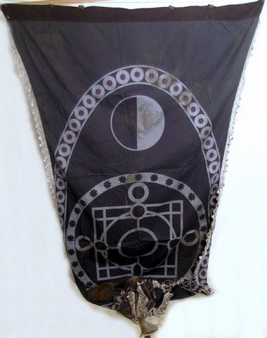 Screen used, hero, worn and distressed purple and light blue design with tassels large banner. (approx. 14' 3/4" x 5')