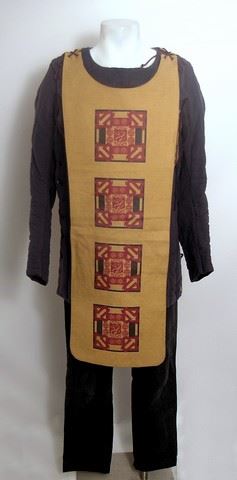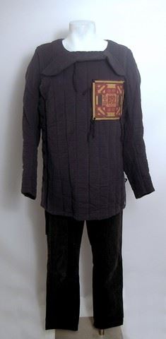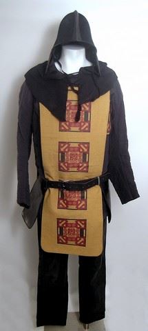 Emperors Guard's screen worn, hero, yellow without sleeves with logo of the castle guard on the front vest, grey cotton padded long sleeve with ties in the back and logo on the front jacket, black hard leather suede with black leather around the collar and ears helmet, black leather with armor belt, and black-grey pants.