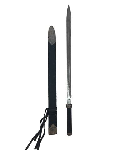 Metal rusted slightly sword with faux leather scabbard, scabbard has leather ties around it. the handle is metal and brown wood. (44x3).