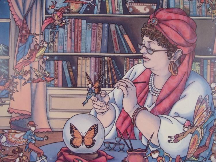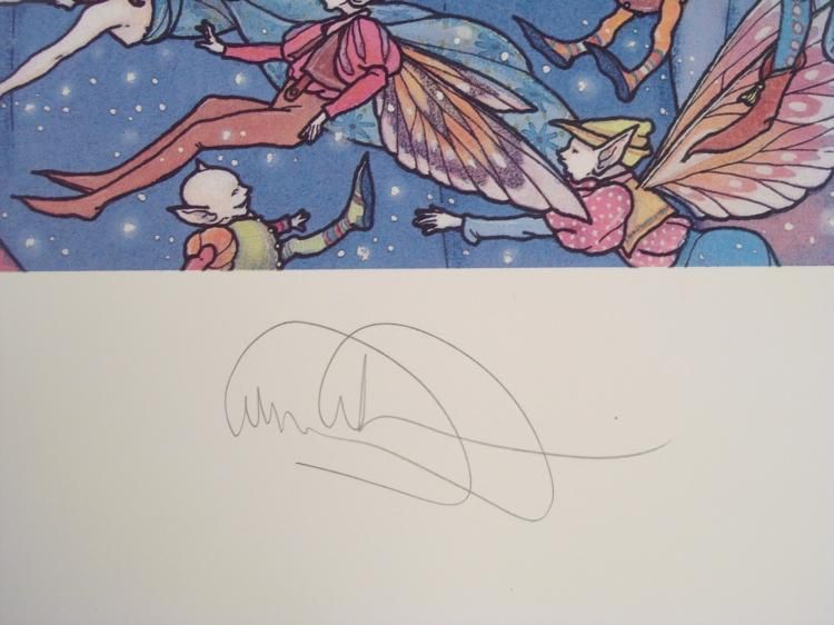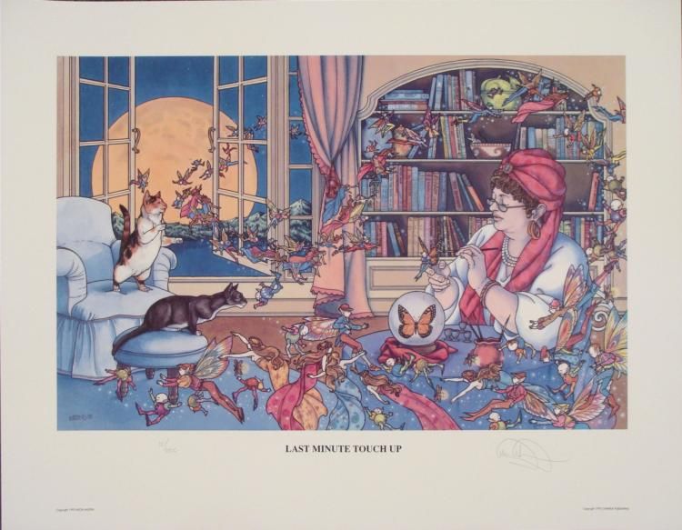 A woman makes faeries in her magical workshop in this amusing fantasy print. * Artist: Alicia AustinSignature: In pencil, lower right Title: Last Minute Touch UpMedium: Print on paper Edition: Numbered out of 600 * Sheet Size: 19" x 24" Condition: ExcellentBiography: * Alicia Austin (1942-_) is an American fantasy and science fiction artist and illustrator. She is inspired by folklore and mythology, and has won awards for her work in book illustration. *