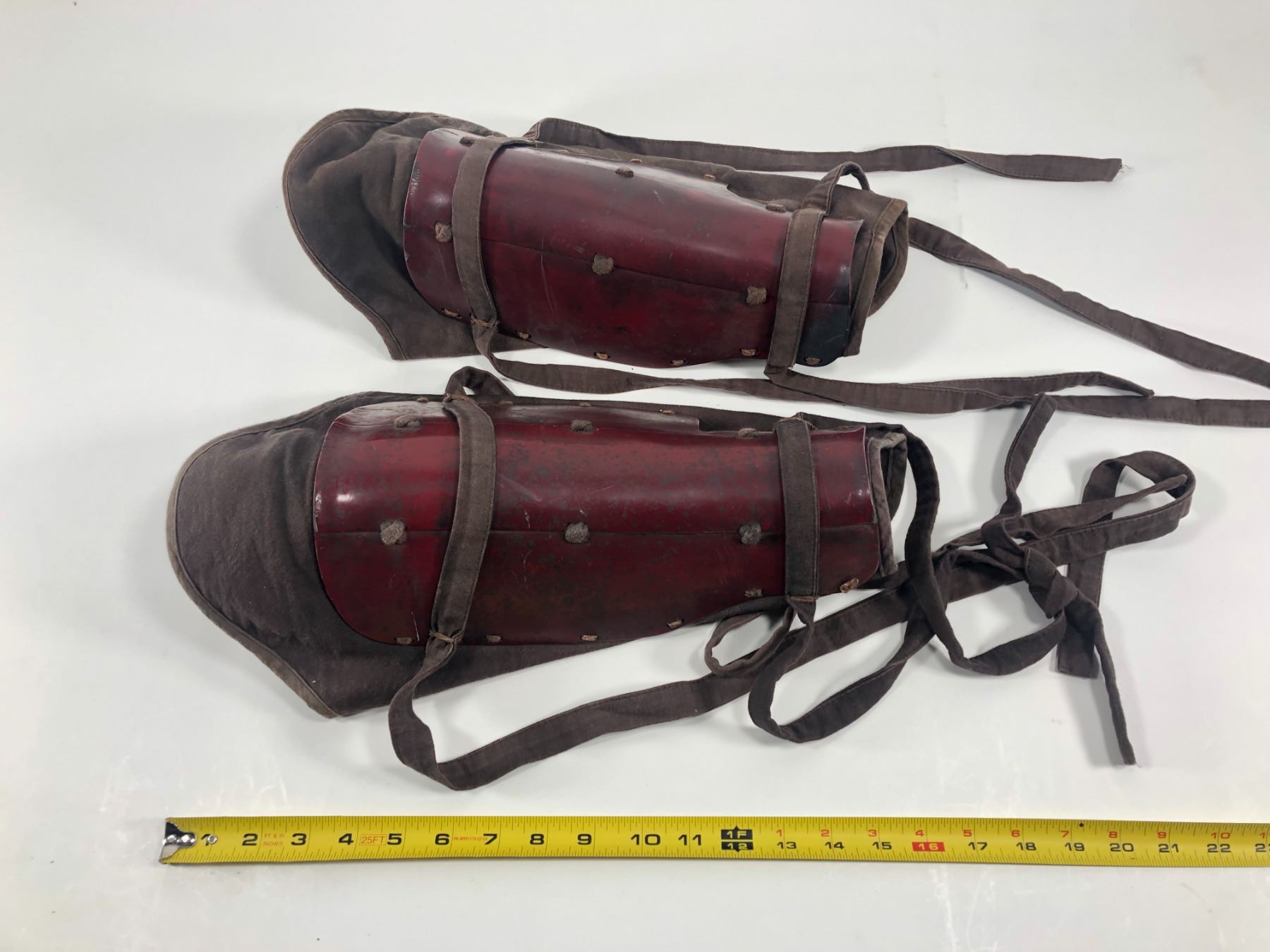 A Pair of Samurai "Suneate" Shin Guards from Edward Zwick's 2003 historical drama, The Last Samurai. In the film, the Samurai warriors wore intricately crafted armor during battle, including shin guards such as this. The suneate is made from a thick brown cotton fabric with a sturdy plastic plating that has been threaded into the material, holding it snug. The suneate attaches to the users leg with two wrap around straps, also made from cotton, that tie with a simple knot. This leg guard remains in good production used condition.