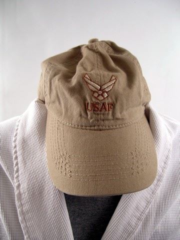 Archie (Morgan Freeman) screen worn, hero, white cotton with self belt 'Aria' bathrobe, grey short sleeve crewneck 'Fila' t-shirt, (size L) tan 'USAF' hat, and tan leather 'Saks Fifth Avenue' sandals. (size 42) Includes wardrobe tag!