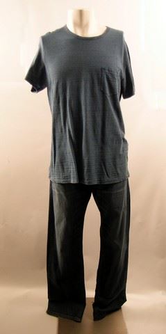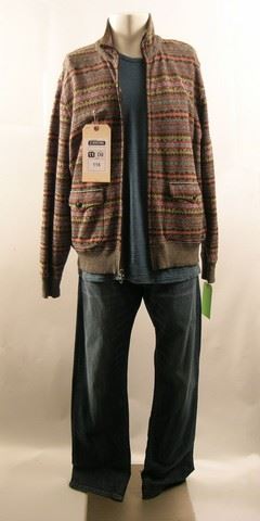 Archie (Morgan Freeman) screen worn, hero, multi color American Indian motif long sleeve zipper front 'Ralph Lauren' sweater, (size XL) denim with front pocket 'Ralph Lauren' t-shirt, (size L) and aged denim 'Levi Strauss' jeans. (size 36x34) Includes wardrobe tag!