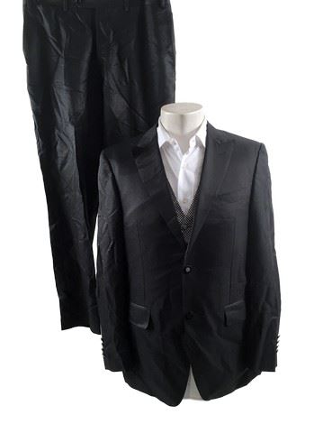 Billy (Michael Douglas) screen worn, hero, black with self stripes two button 'Canali' suit jacket and matching pants, (size 50R) silver and black print button up the front 'Canali' vest, and white long sleeve button front 'Canali' dress shirt. (size 40-15 3/4)