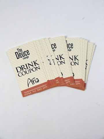 Screen used, stack of Aria Hotel "Drink Coupon" paper coupons. (approx. 6" x 3 1/2" each) This coupon is a prop and has no value at Aria.