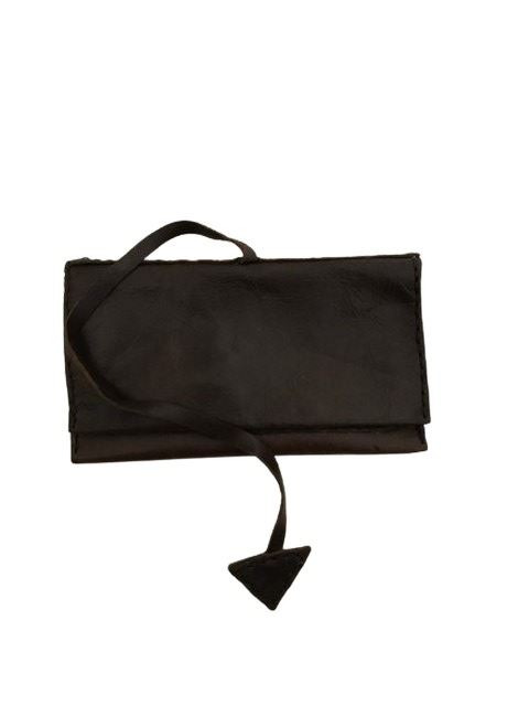 "Generik" Austrailian leather burgundy/brown wallet with leather tie. Inside is a sewn in pocket and a section with a zippered pocket.